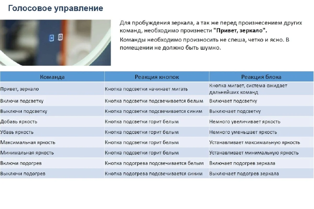 Команды для голосового управления: Привет, зеркало; Включи подсветку; Выключи подсветку; Добавь яркость; Убавь яркость; Максимальная яркость; Минимальная яркость; Включи подогрев; Выключи подогрев.