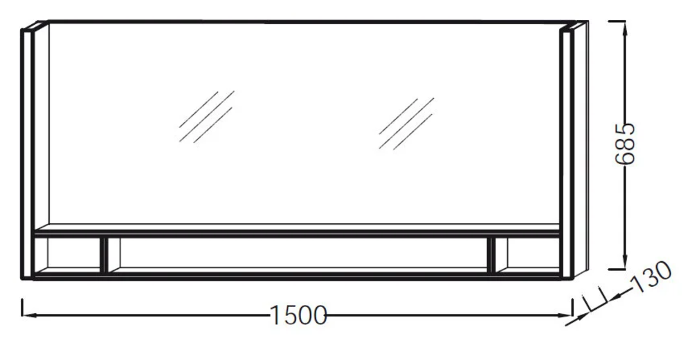 Размер: Ш150*Г13*В68,5 см Светодиодная подсветка справа и слева Полочка из цельного дерева Светильники: 230В, 14,4 Вт, класс II IP24