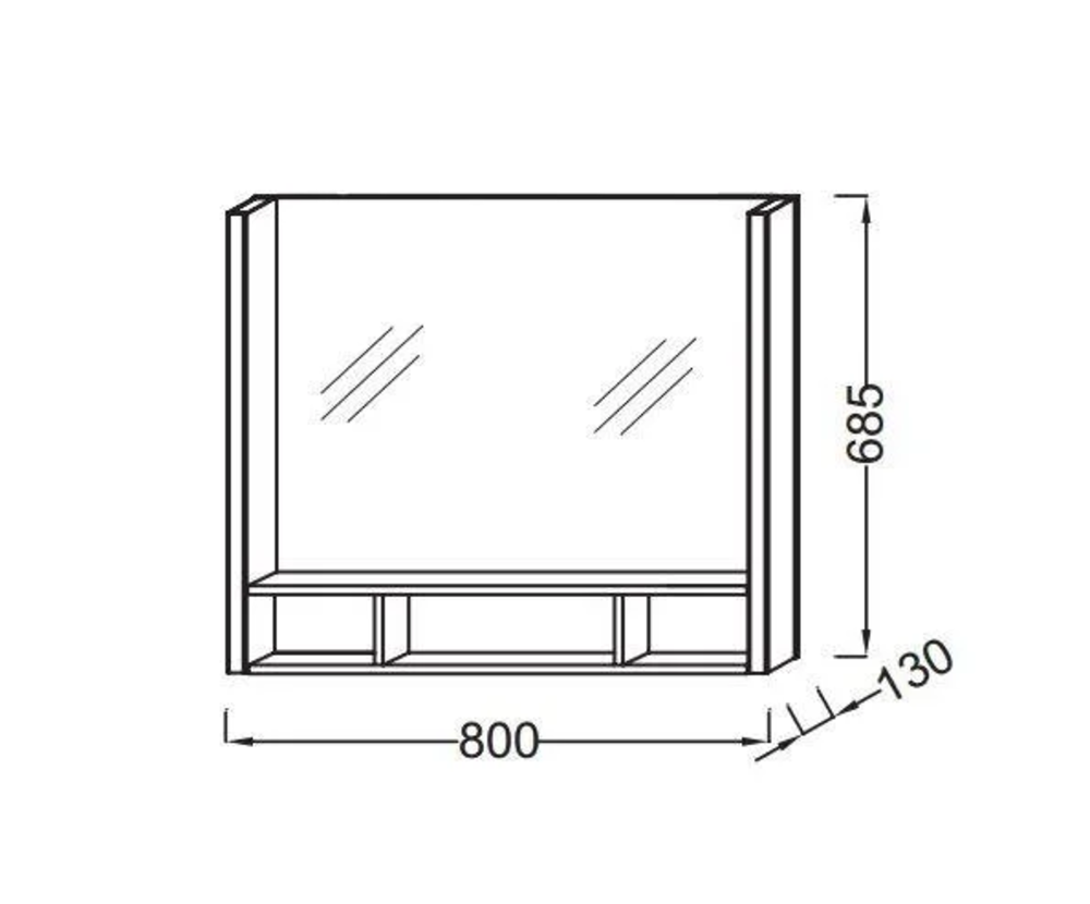 Размер: Ш80*Г13*В68,5 см Светодиодная подсветка справа и слева Полочка из цельного дерева Светильники: 230В, 14,4 Вт, класс II IP24