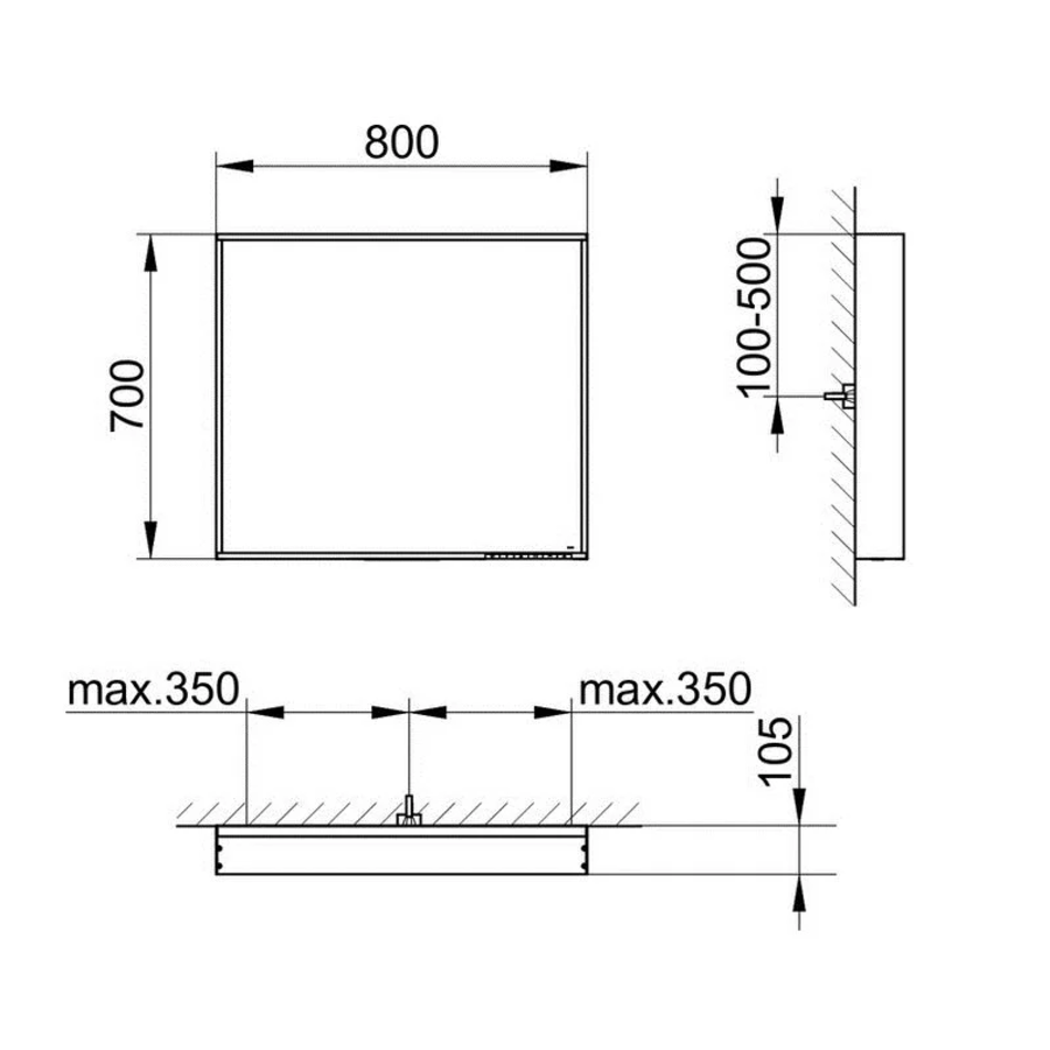 Плавная регулировка цвета подсветки от 2700 Кельвин (теплый белый) до 6500 Кельвин (яркий дневной свет), алюминиевая рама по периметру зеркала, лакированная.