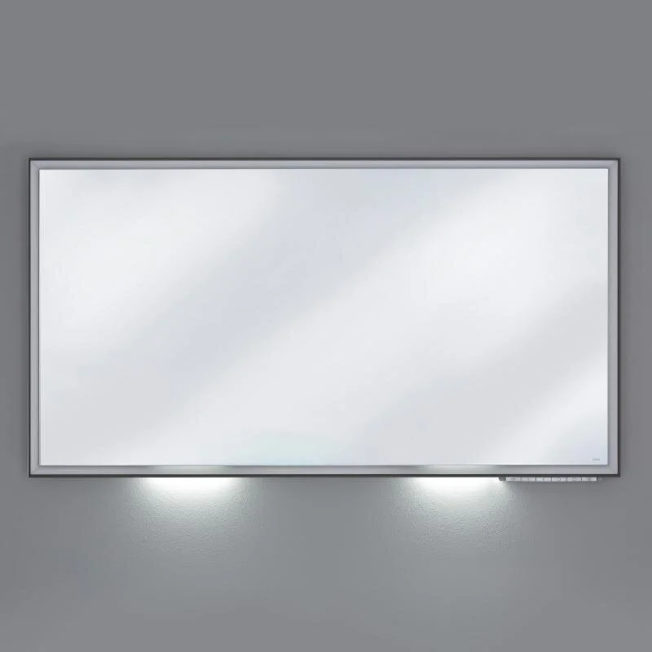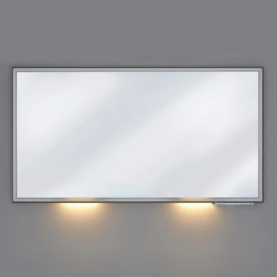 Со встроенным круговым светодиодным освещением Срок службы светодиодов более 30 000 часов панель управления с емкостным сенсорным датчиком может дополнительно управляться с помощью основного выключателя освещения в помещении с плавной регулировкой цвета освещения от дневного белого (6500K) до теплого белого (2700K). подсветкой умывальника можно управлять отдельно в корпусе из черного анодированного алюминия с зеркалом обогрев автоматически отключается через 20 минут