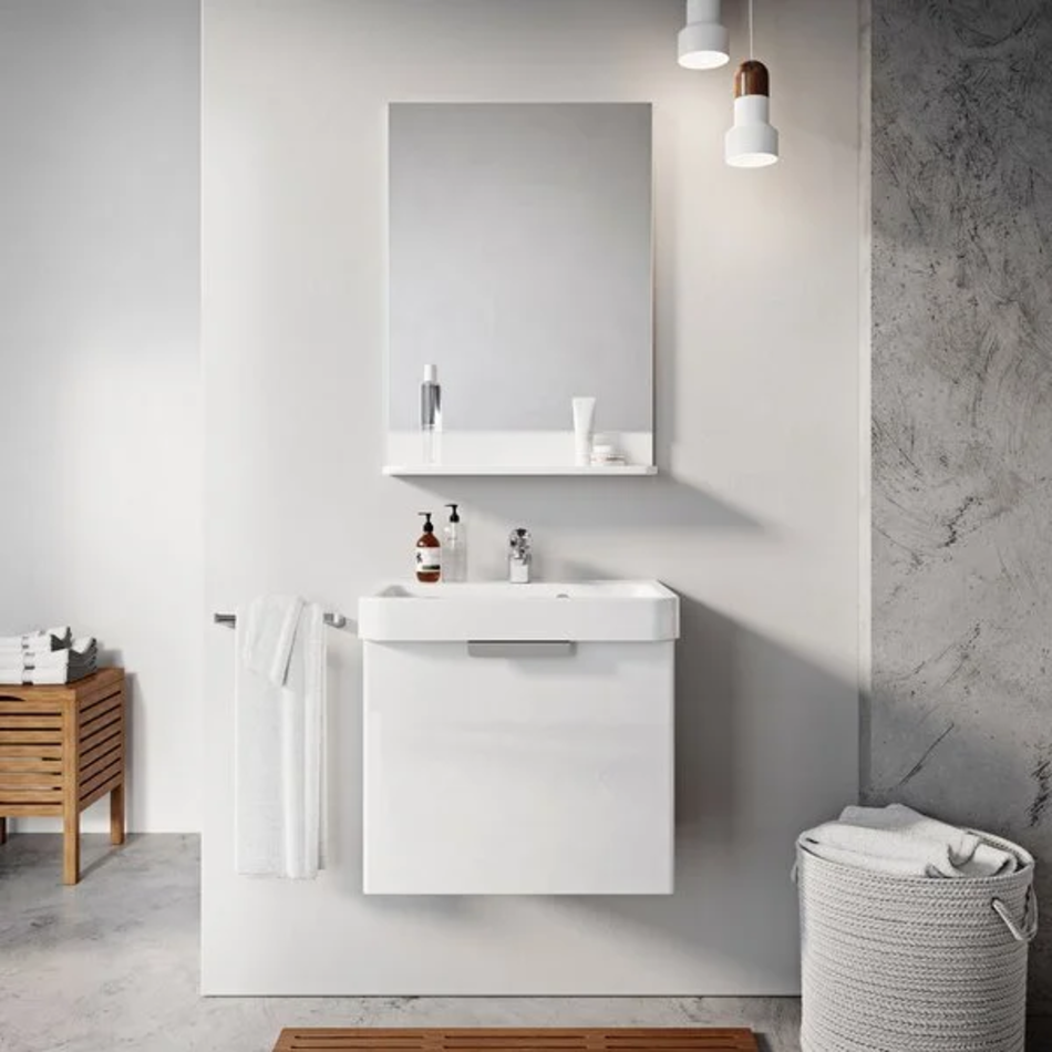 Ванная комната BeHappy II стала идеальной. Зеркало с полкой идеально дополняет умывальник и шкаф от концепции BeHappy II.