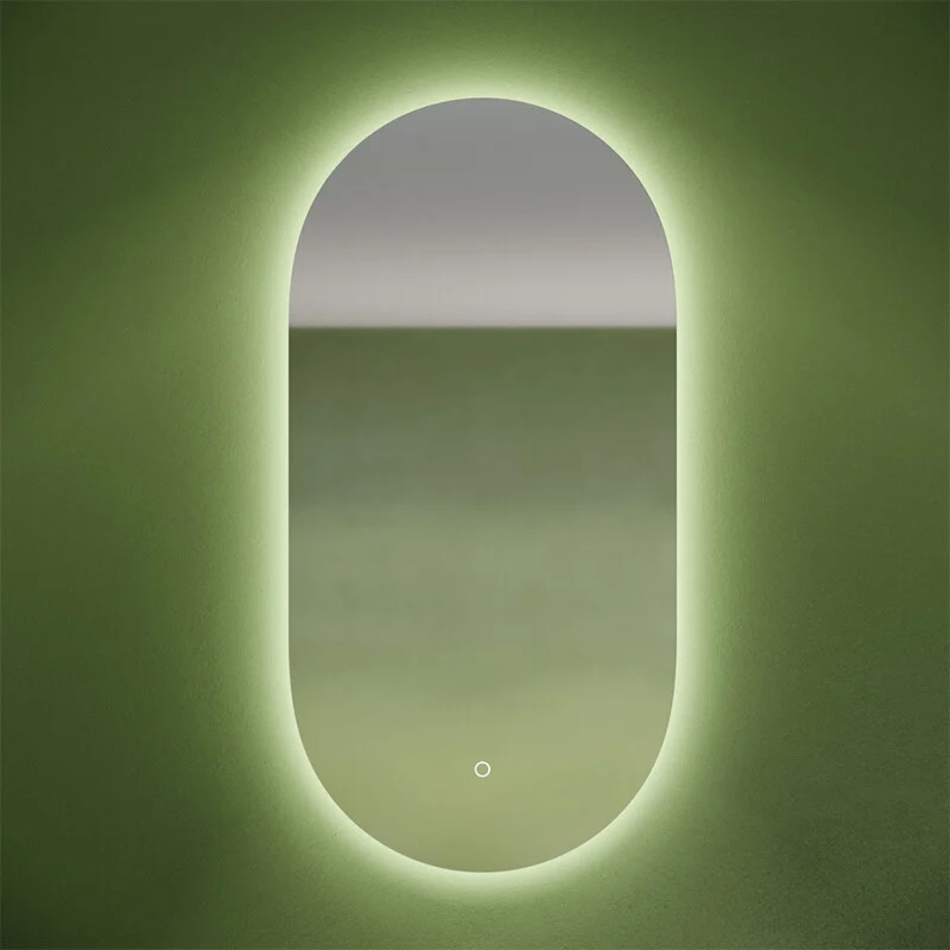 Зеркало овальное с фоновой подсветкой. Настенный монтаж . Размер 450 x 900 мм.Температура света 6000 K. Управление прикосновением. Диммируемый сенсор регулировки подсветки.