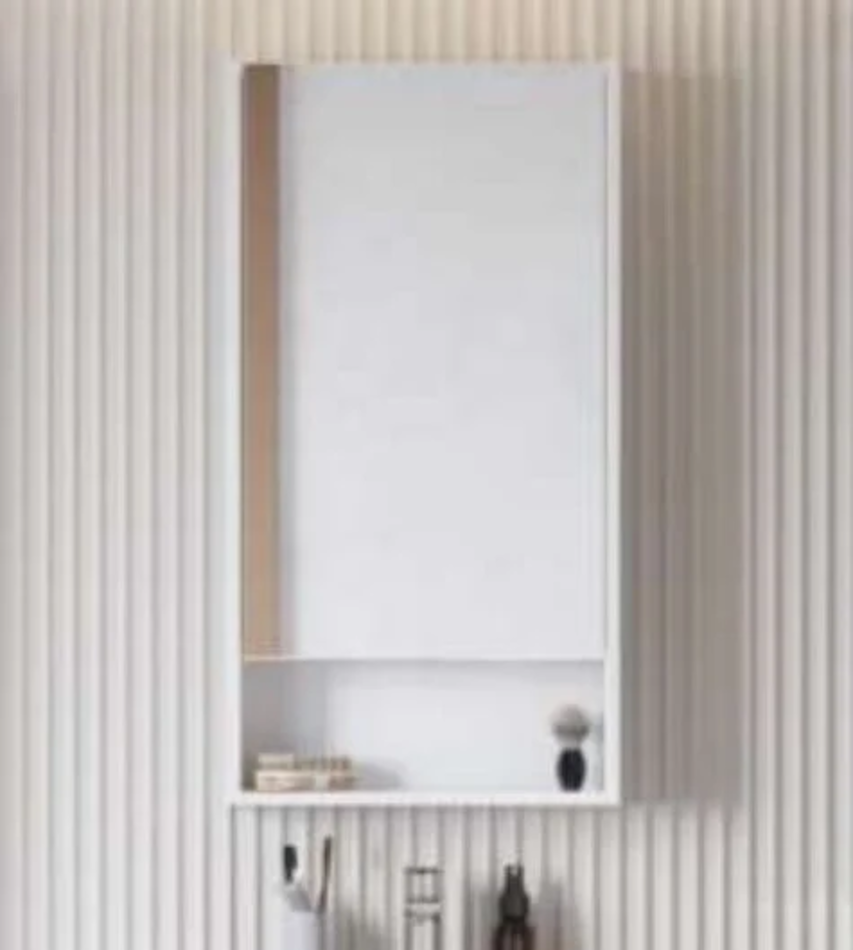 Зеркальный шкаф Размер: 45 x 13 x 85 см Двери распашные: 1 Монтаж: подвесной Система плавного закрывания Полки стеклянные: 2 Пола открытая Материал: ЛДСП Форма: прямоугольная Цвет: белый