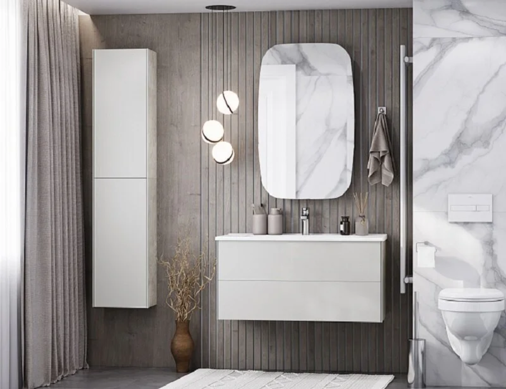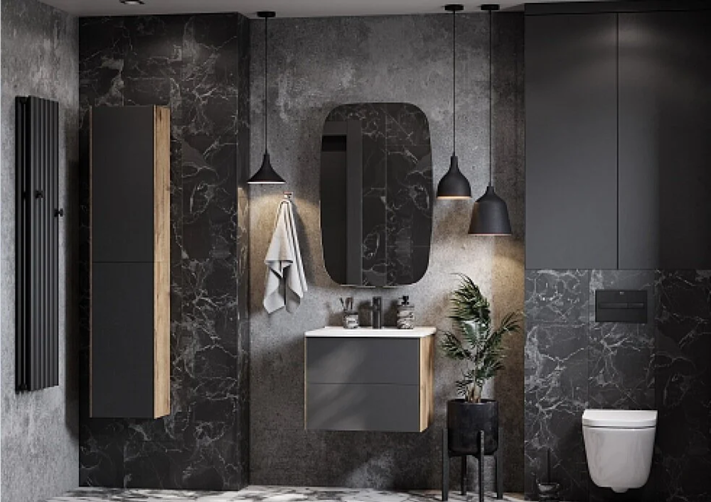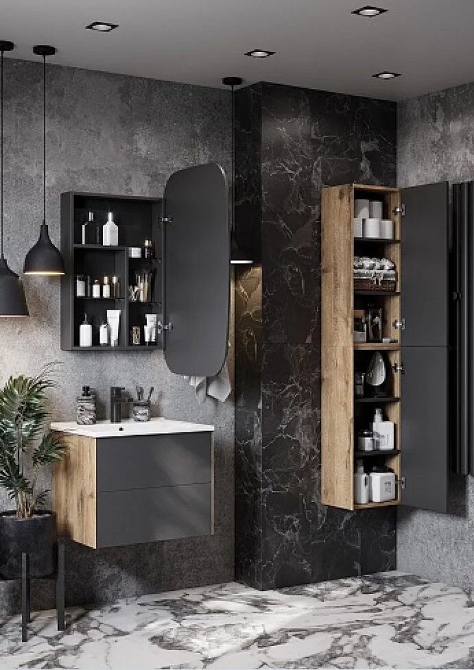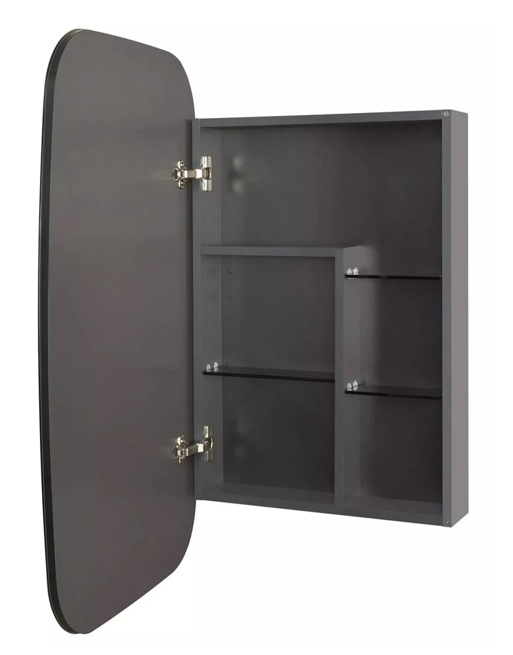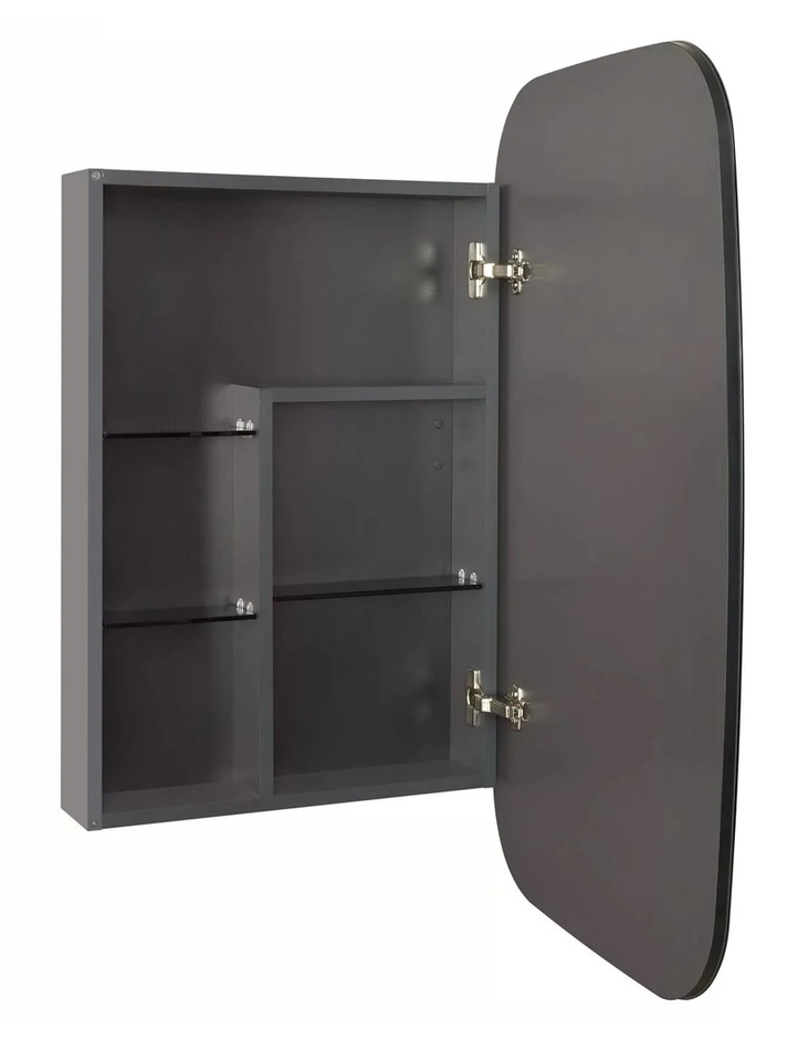 Сохо зеркало необычной овальной формы, скругленные углы добавляют индивидуальности изделию и безопасны в эксплуатации. Корпус и фасад выполнены также в цветовой гамме антрацит. Фасад оснащен петлями с доводчиком. За фасадом с зеркальным полотном расположена асимметричная конструкция полочек, позволяющая хранить косметические средства различной высоты и объема. Перегородки из ЛВДСП антрацит сочетаются со стеклянными полочками цвета графит.