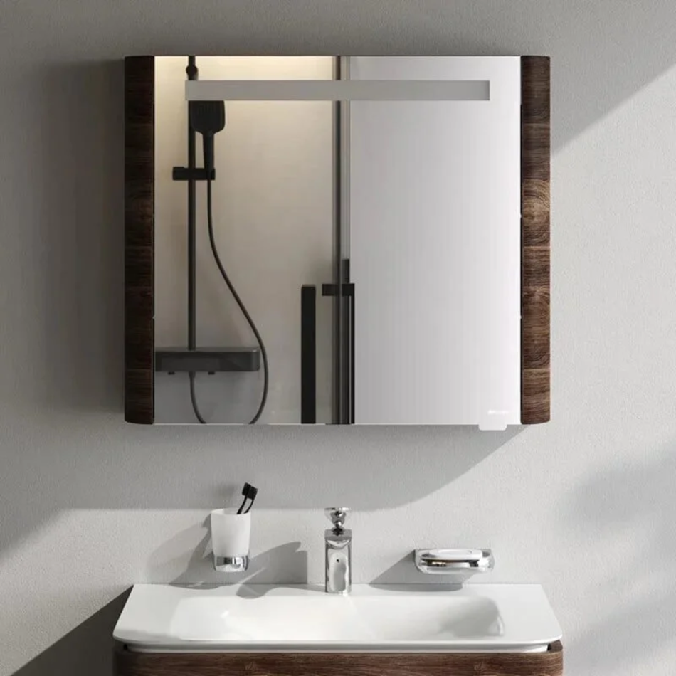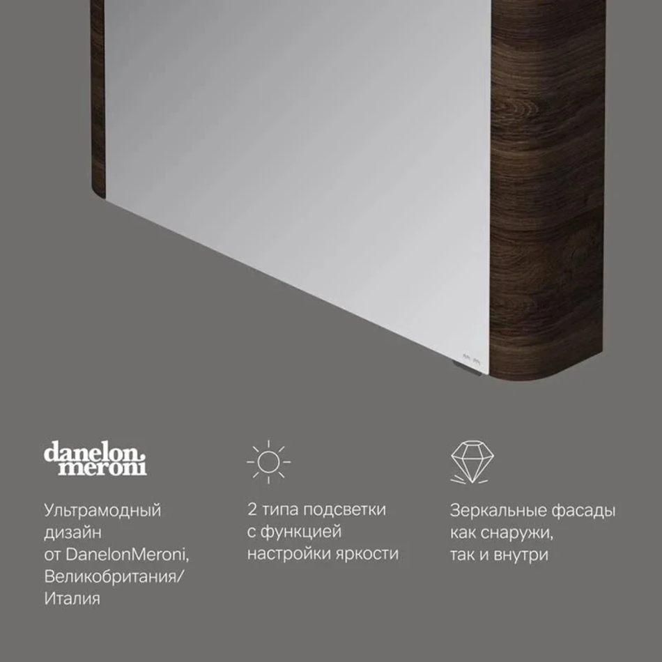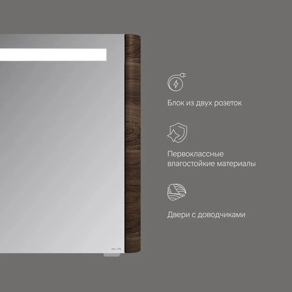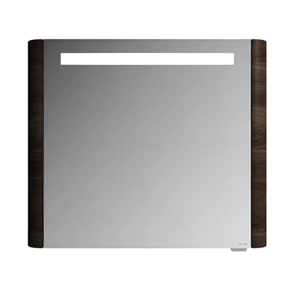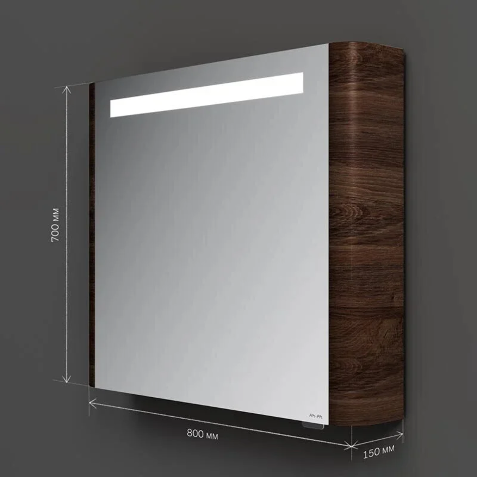 Зеркальный шкаф 80 см, левый, материал МДФ и зеркальное полотно, покрытие шпон, цвет орех. С подсветкой LED 16 W (два типа подсветки - теплый и холодный), с функцией настройки яркости, розетка, сенсорный выключатель в комплекте, доводчиками, двумя полками.