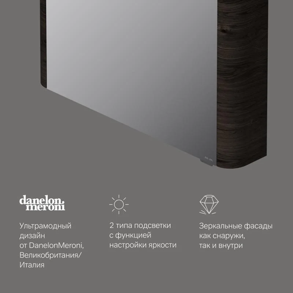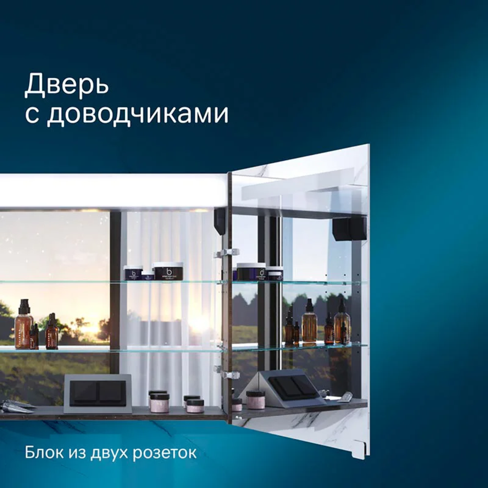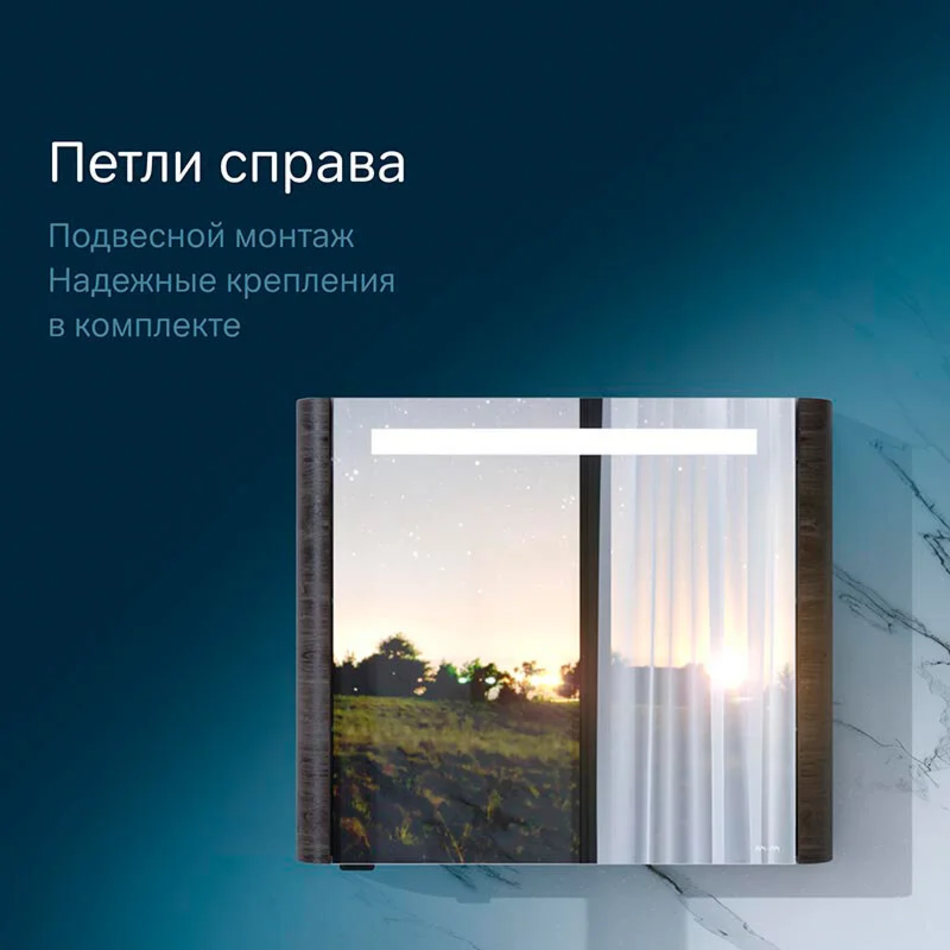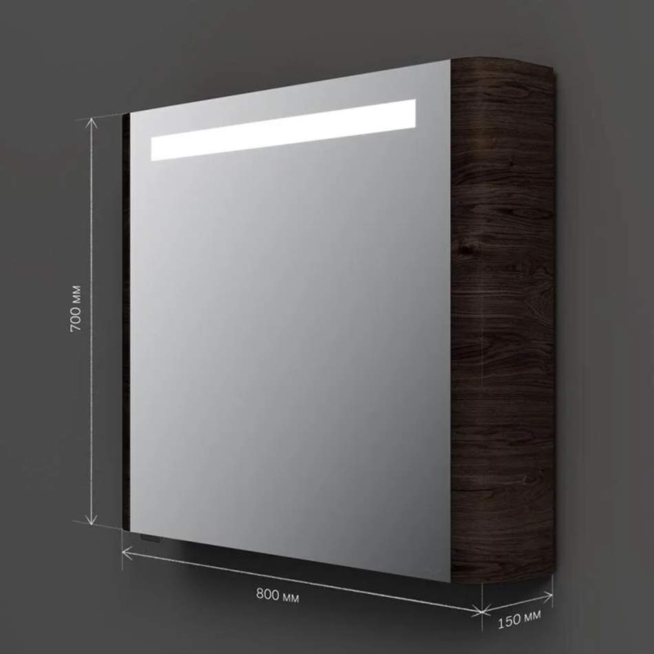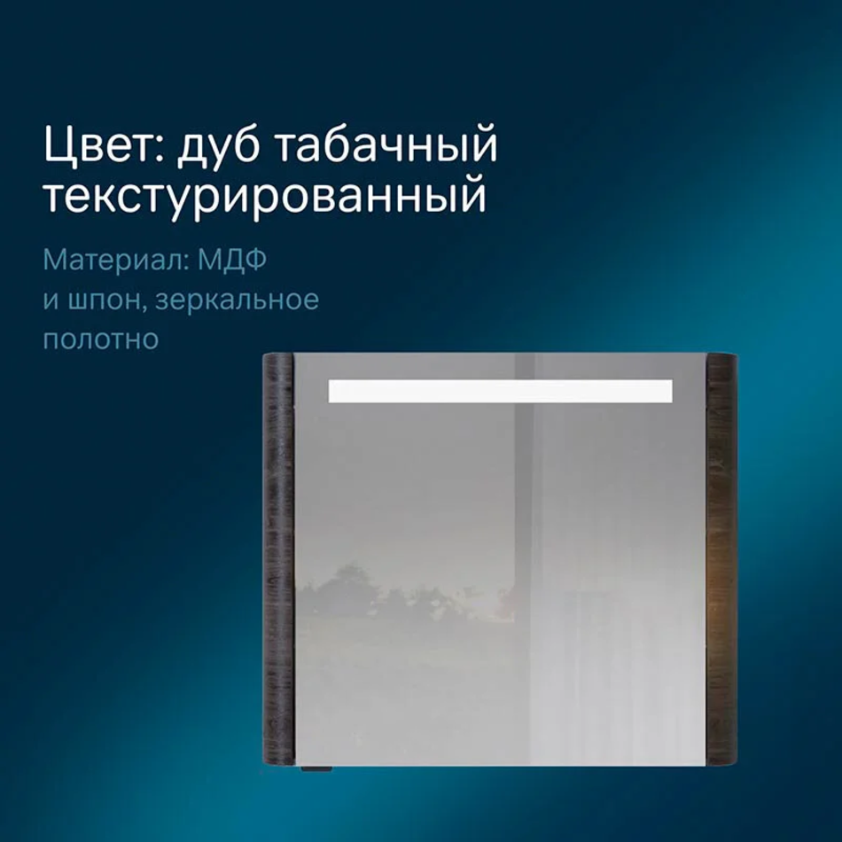 Зеркальный шкаф 80 см, левый, материал МДФ и зеркальное полотно, покрытие шпон, цвет табачный дуб. С подсветкой LED 16 W (два типа подсветки - теплый и холодный), с функцией настройки яркости, розетка, сенсорный выключатель в комплекте, доводчиками, двумя полками.