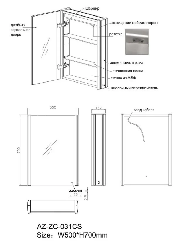 Зеркальный шкаф Azario Quito AZ-ZC-031CS, 50 см, с подсветкой, белый
