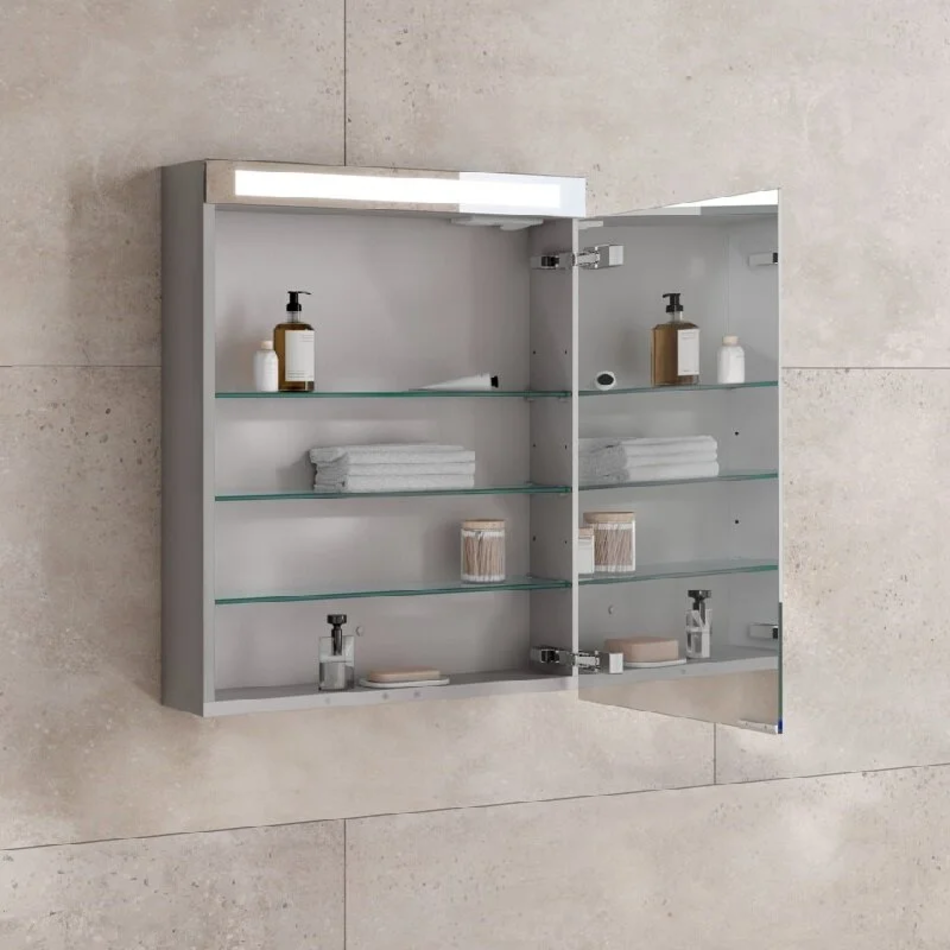 Оснащение зеркала: подвесы, 1 розетка внутри, 3 стеклянные полки, регулируемые по высоте