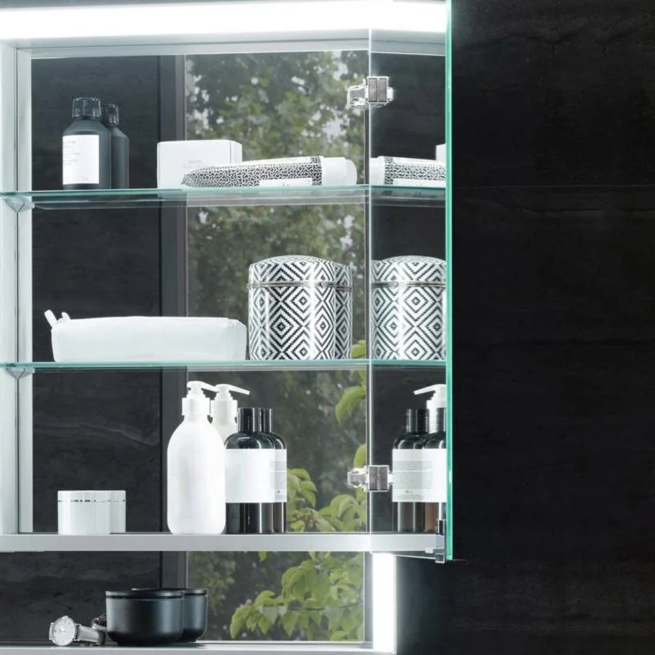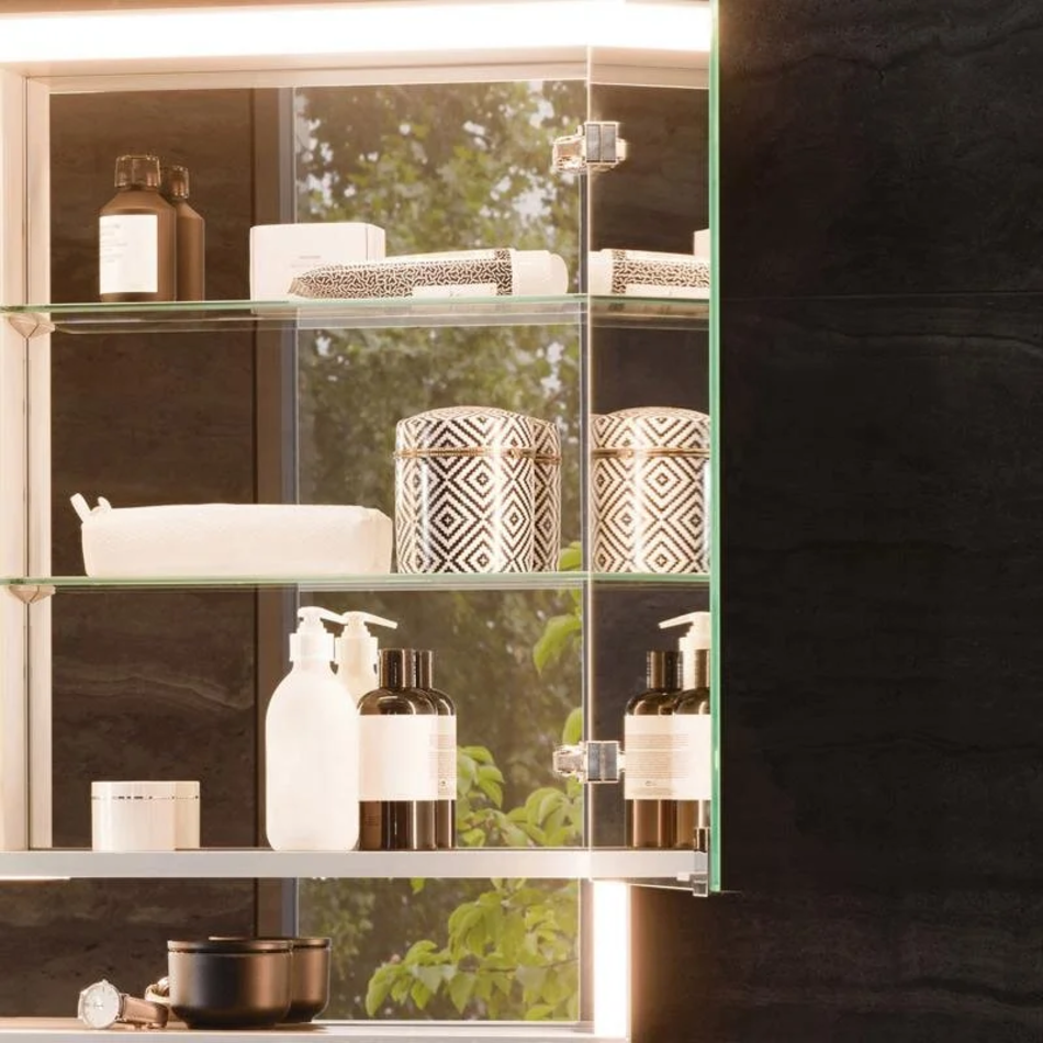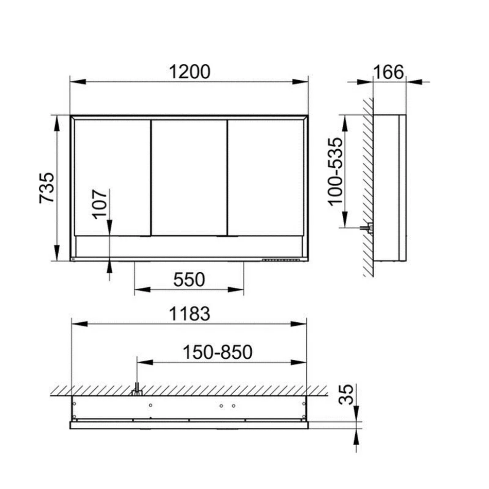 Для монтажа на стене, с подогревом, бесступенчатая настройка тона подсветки от 2700 Кельвин (теплая белая) до 6500 Кельвин (дневной свет), 3 поворотные дверцы с двусторонним озеркаливанием стекла, корпус из анодированного серебристого алюминия, задняя стенка зеркальная.
