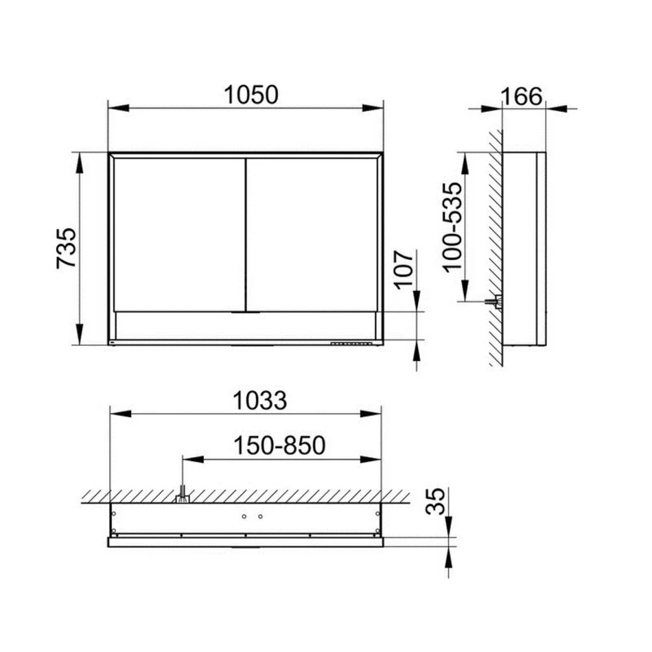 Кельвин (теплая белая) до 6500 Кельвин (дневной свет), 2 поворотные дверцы с двусторонним озеркаливанием стекла, корпус из анодированного серебристого алюминия, боковины корпуса из белого лакированного стекла, задняя стенка зеркальная.