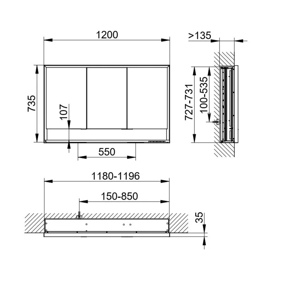 Для встраиваемого монтажа, бесступенчатая настройка тона подсветки от 2700 Кельвин (теплая белая) до 6500 Кельвин (дневной свет), 3 поворотные дверцы с двусторонним озеркаливанием стекла, корпус из анодированного серебристого алюминия, задняя стенка зеркальная.