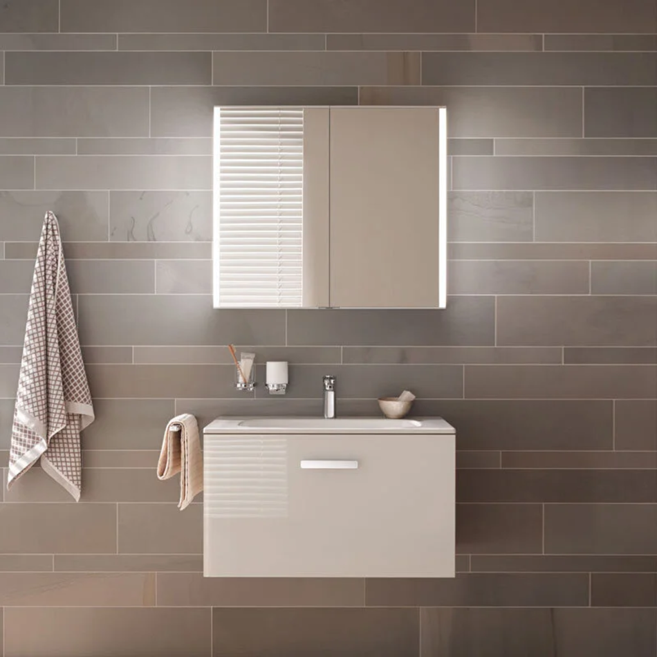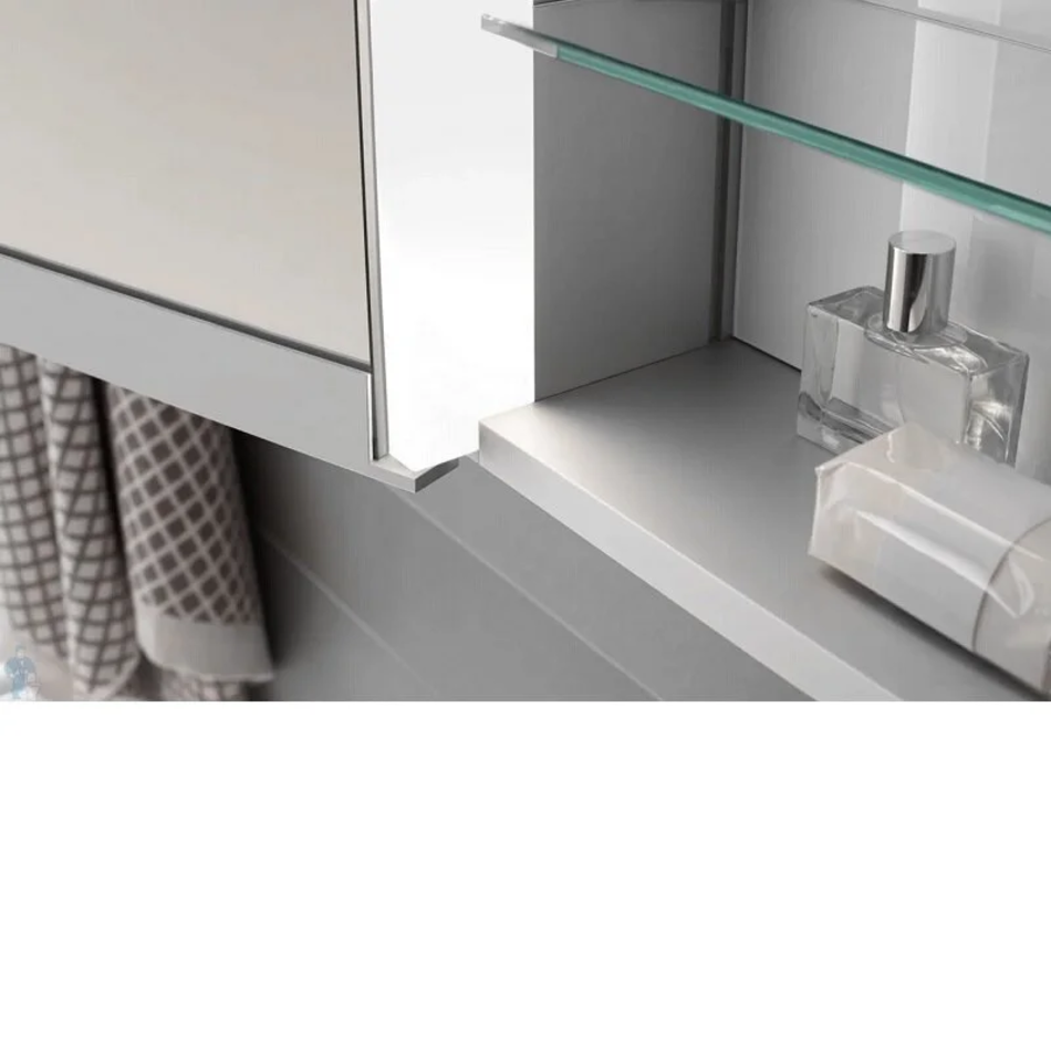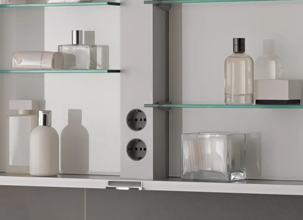 Слева и справа установлены светодиодные элементы с яркой подсветкой. Потребление энергии минимально. Теплый белый цвет подсветки создает приятную атмосферу. Срок службы встроенных светодиодов составляет более 30 000 часов и будет радовать вас долгие годы. Светом можно управлять как с помощью выключателя основного освещения в помещении, так и с помощью сенсорного датчика. Зеркальный шкаф также подсвечивается изнутри.