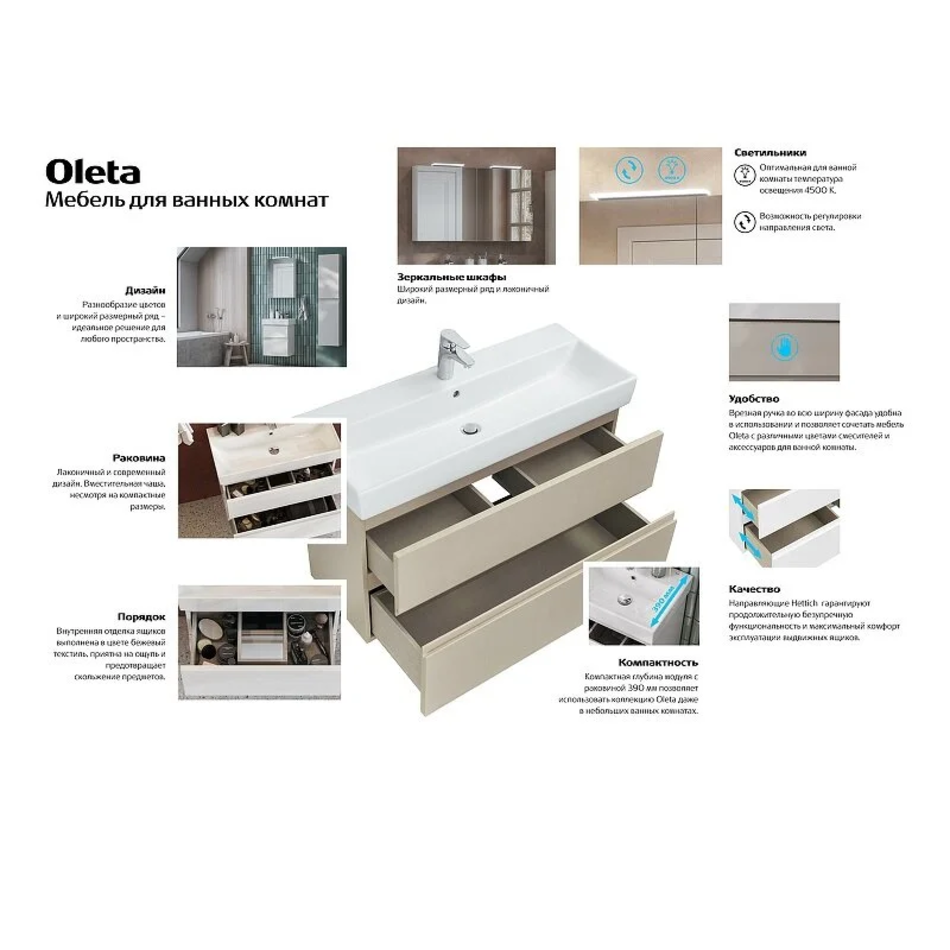 Зеркальный шкаф OLETA оснащен светильником от европейского бренда Ebir с возможностью регулировки положения, IP 44, 5 700 K. Теплота света у светильника 5 700 K – это яркий свет, идеальный для нанесения макияжа и бритья. Положение светильника можно регулировать: наклонить слегка вниз или направить свет повыше. За зеркальными фасадами расположены регулируемые по высоте полочки из просветленного стекла. Фасады оснащены петлями Hettich с плавным закрыванием.