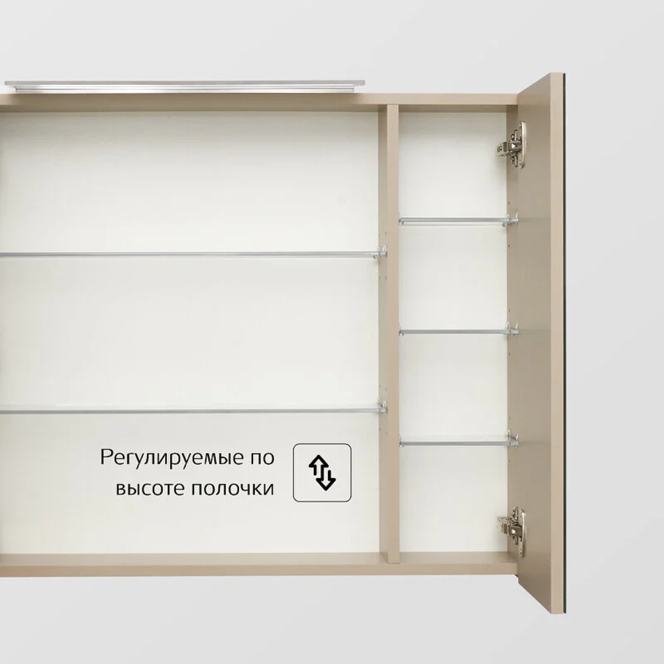 еркальный шкаф OLETA оснащен светильником от европейского бренда с возможностью регулировки положения, IP 44, 5 700 K. Теплота света у светильника 5 700 K - это яркий свет, идеальный для нанесения макияжа и бритья. Положение светильника можно регулировать: наклонить слегка вниз или направить свет повыше. За зеркальными фасадами расположены регулируемые по высоте полочки из просветленного стекла. Фасады оснащены петлями с плавным закрыванием.