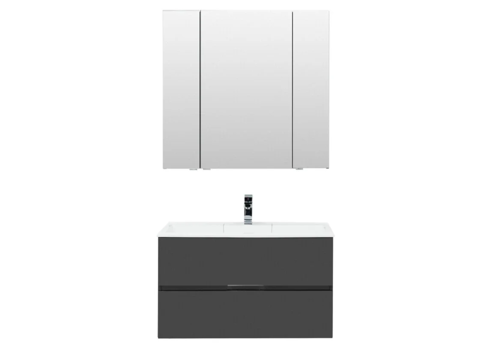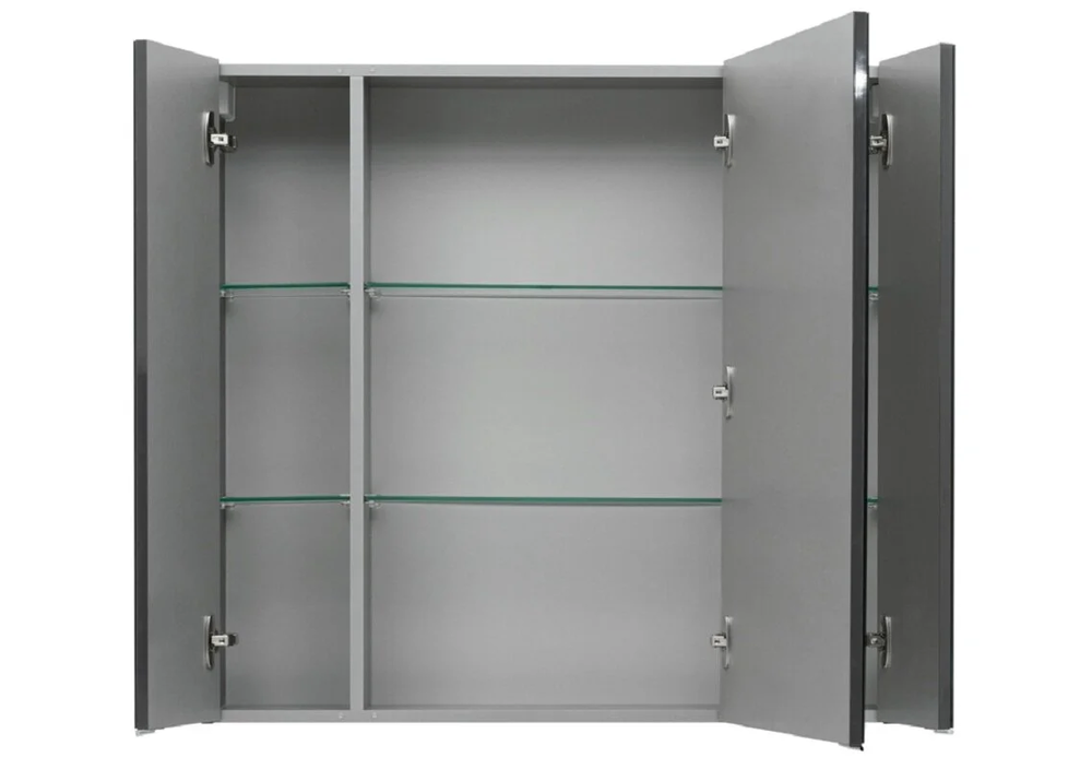 Размер: 90*17*85 см Двери: 3 распашные Материал: ЛДСП Покрытие: краска/глянец Цвет: серый антрацит Светильник приобретается отдельно.